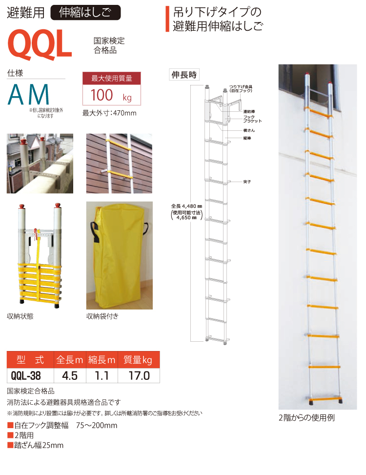 ピカ/Pica 避難用伸縮はしご QQL-38 最大使用質量:100kg 全長:4.5m