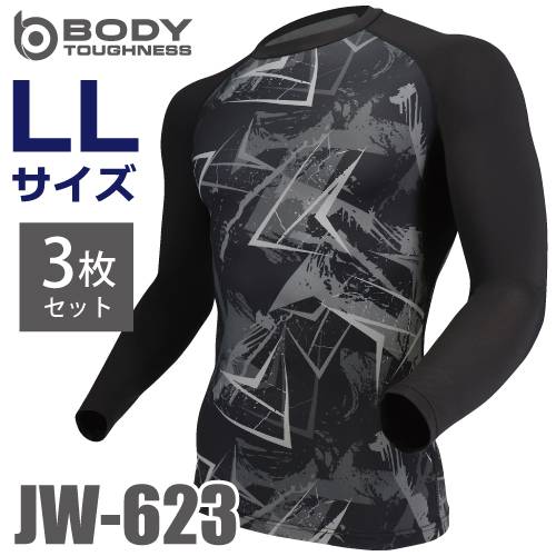 おたふく手袋 パワーストレッチシャツ 長袖クルーネック JW-623 カモフラ×ブラック LLサイズ 3枚入 接触冷感 速乾 吸汗 UVカット インナーシャツ
