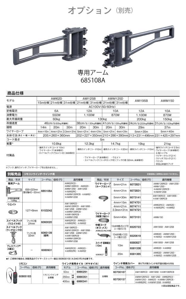 □付属品:操作スイッチ(コード10m)、ワイヤーロープ(本体取付)、ラッチロックフック(本体取付・フック口径32mm)