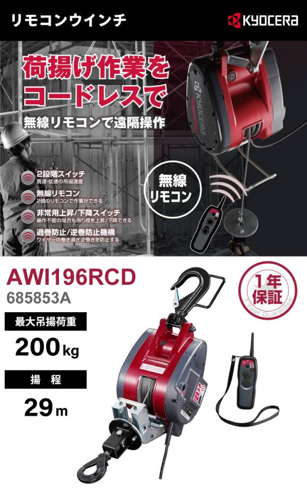京セラインダストリアルツールズ リモコンウインチ AWI196RCD 30m仕様 685853A ラッチロックフック付属 最大吊揚荷重:200kg 揚程:29m 単相100V  無線リモコン