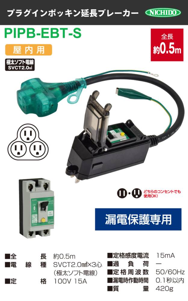 日動工業 プラグインポッキンブレーカー PIPB-EBT-S 漏電保護専用 屋内型 漏電遮断器 0.5m アース付