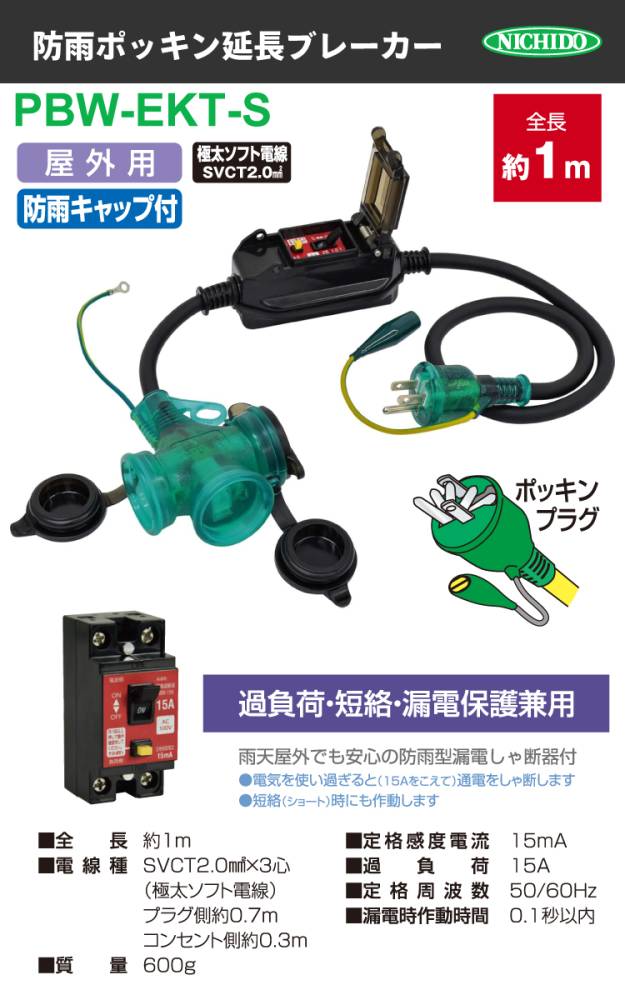 日動工業 防雨ポッキン延長ブレーカー 1m PBW-EKT-S 過負荷・漏電保護兼用 屋外用・防雨型 漏電遮断器付 延長コード ポッキンプラグ