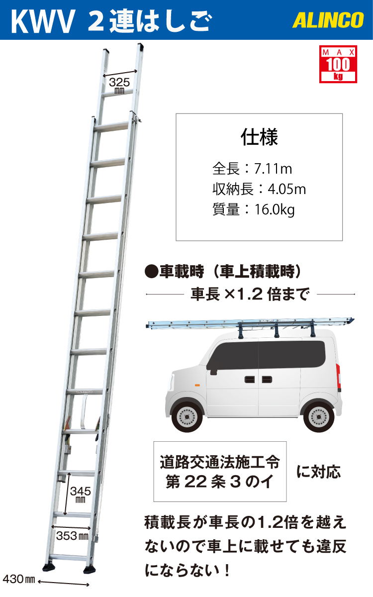 アルインコ(配送先法人限定) 2連はしご KWV-71D 全長:7.11m 使用質量:100kg 軽バン積載可能