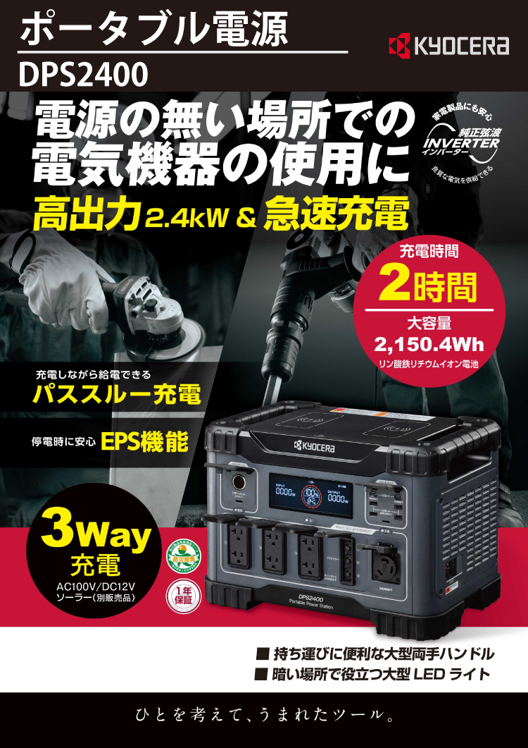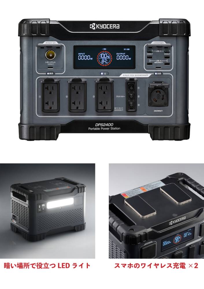 京セラ ポータブル電源 DPS2400 2,150.4Wh 純正弦波インバーター搭載 定格出力:2,400W 質量:30.5kg 669506A リン酸鉄リチウムイオン電池