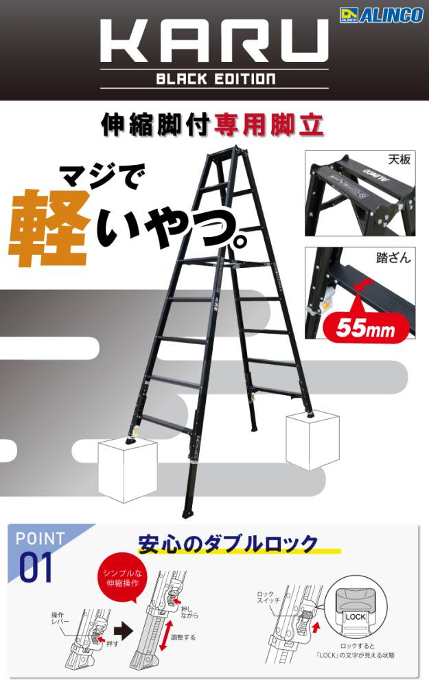 アルインコ 軽量型 伸縮脚付専用脚立 ブラック KARU-210BK 6段 (6尺・7尺) 天板高さ:1.70~1.99m
