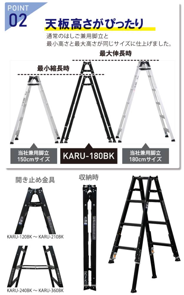 □通常のはしご兼用脚立と最小高さと最大高さが同じサイズ