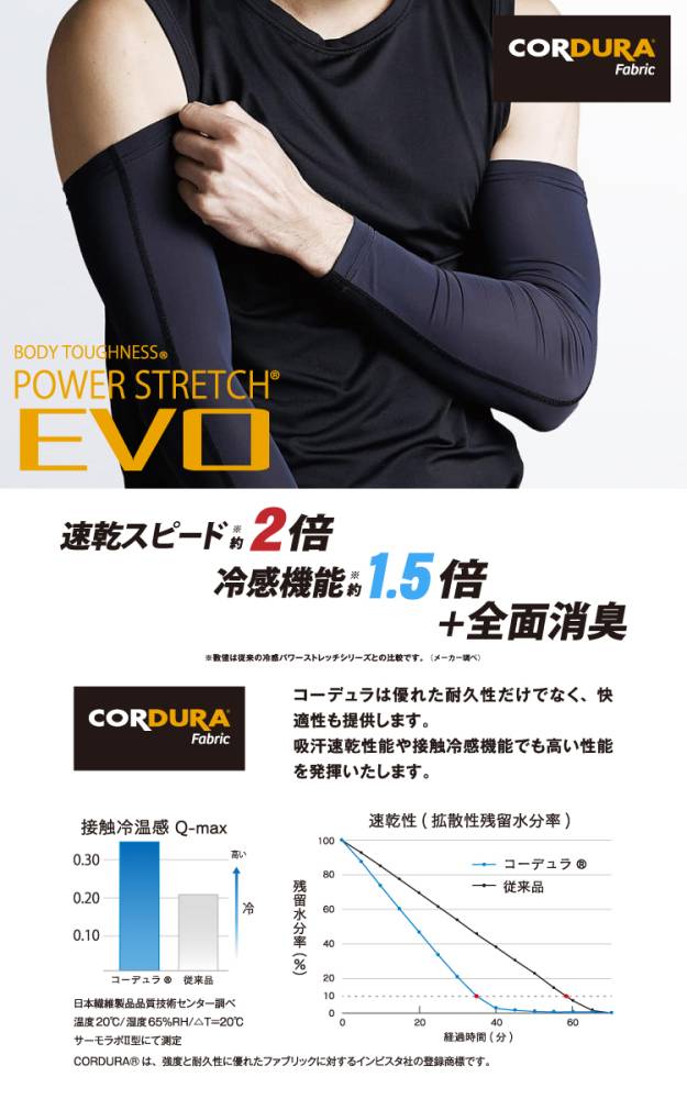 □従来の冷感パワーストレッチシリーズより速乾スピードは約2倍!冷感機能約1.5倍!さらに全面消臭機能付き!