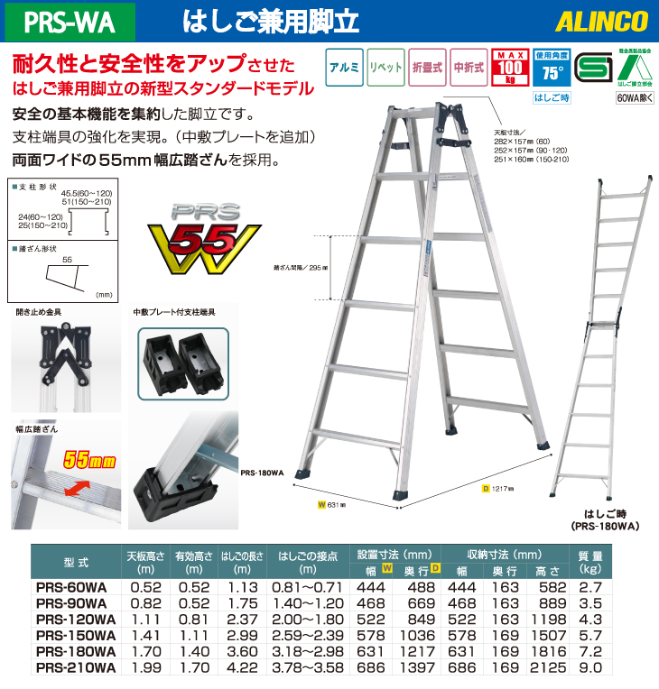 アルインコ はしご兼用脚立 PRS-60WA 天板高さ:0.52m 最大使用質量:100kg