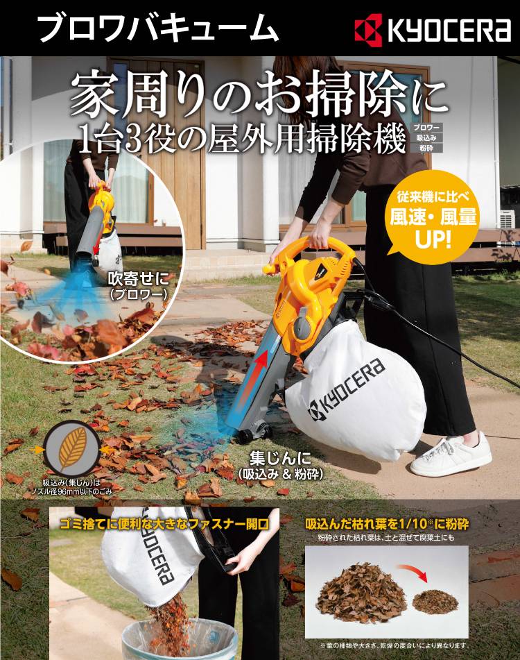 □吹き寄せ・集じん&粉砕が1台3役の電気式屋外用掃除機!