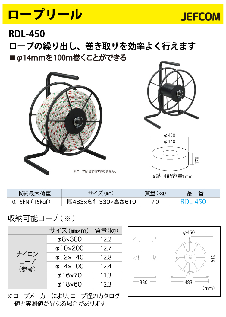 ジェフコム/デンサン (配送先法人様限定) ロープリール RDL-450 サイズ:幅480×奥行328×高さ585mm