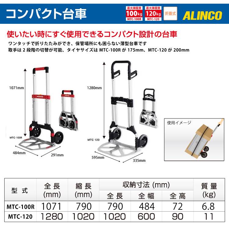 アルインコ コンパクト台車 MTC-100R MAX100kg 質量6.8kg 折りたたみ式2輪台車
