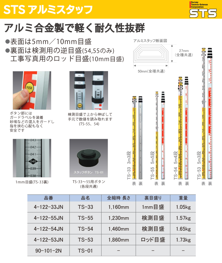 STS アルミスタッフ TS-53 全縮時長さ:1,860mm 裏目盛:ロッド目盛
